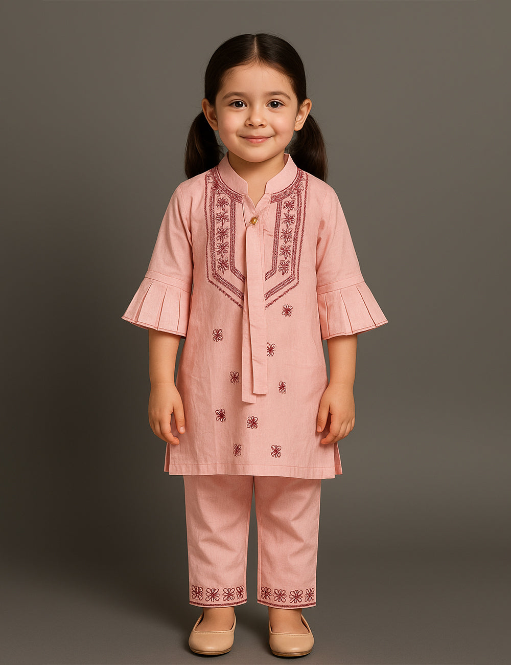 Sweet and charming, this 2-piece kurta set features a soft blush pink base adorned with delicate maroon embroidery on the bodice, sleeves, and hem. The kurta comes with pleated bell sleeves and a front tie detail, paired with matching trousers for a coordinated look. Designed for girls aged 6 to 12, this outfit is perfect for festive celebrations, family gatherings, or special outings offering a graceful blend of comfort and style.