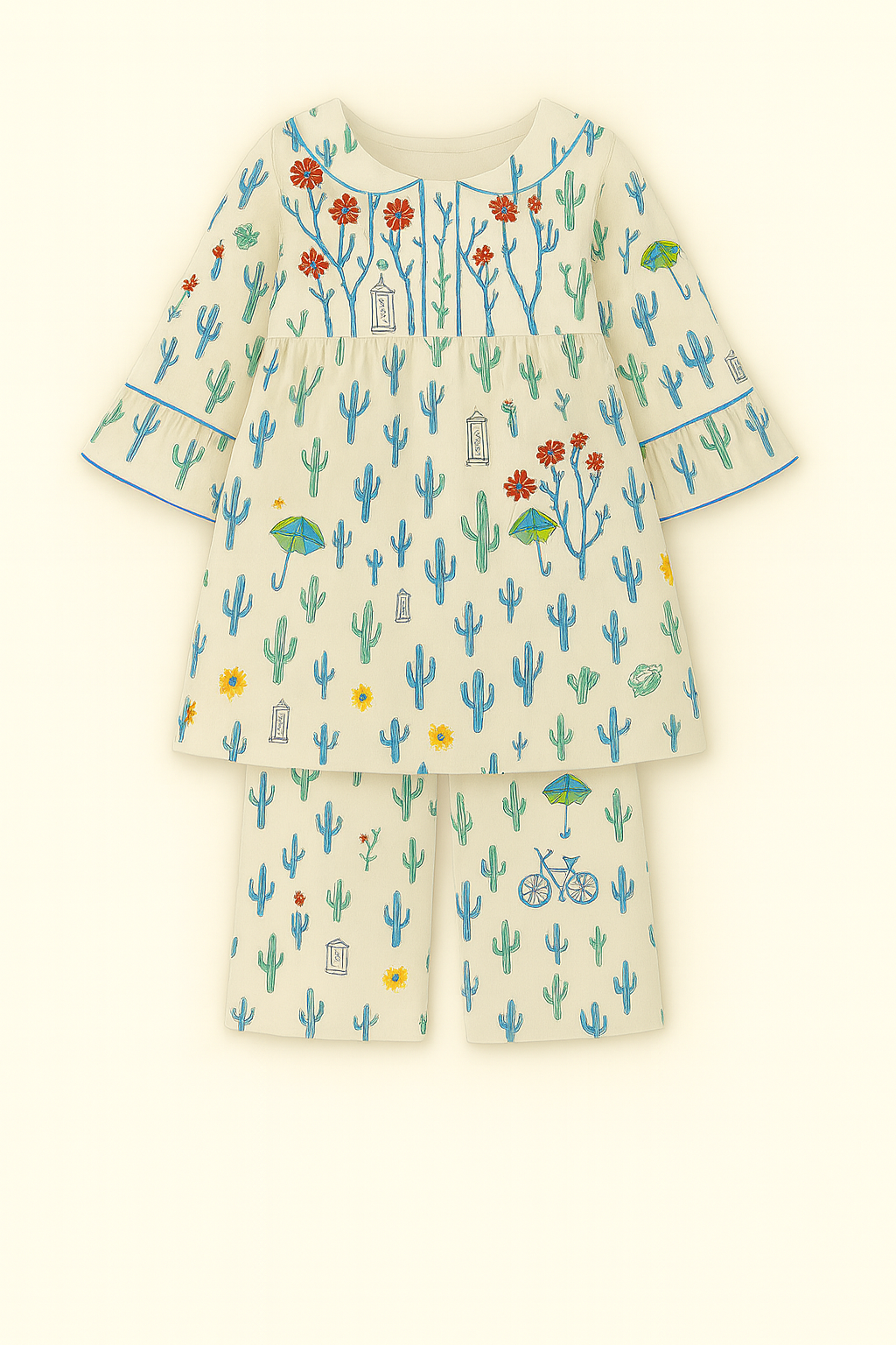Add a playful twist to style with this vibrant 2-piece kurta set. Featuring a charming cactus and floral print in cheerful shades of blue and green, the kurta is enhanced with bright red embroidered florals and flared sleeves for extra flair. Paired with matching straight-leg trousers, this outfit is perfect for fun-filled days and festive occasions. Designed for ages 6 to 12.