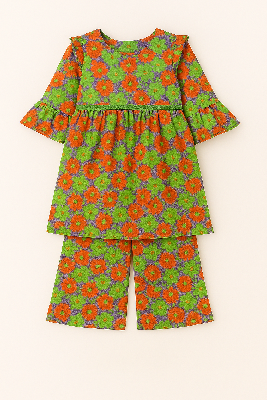 Lively and full of color, this 2-piece kurta set features a burst of bold floral patterns in vibrant orange, green, and purple. The peplum-style top with flared sleeves adds a playful twist, while the wide-leg matching trousers keep it comfy and stylish. Crafted for girls aged 6 to 12, this cheerful ensemble is ideal for festive occasions, birthday parties, or fun family outings. A perfect mix of tradition and whimsy!
