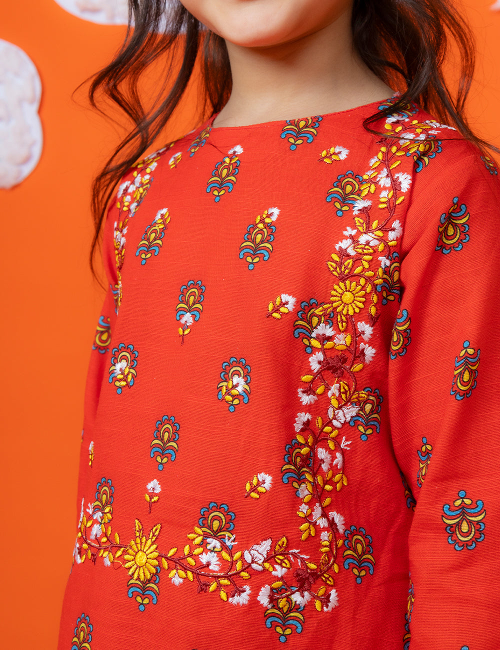The tunic-style top features a vibrant orange-red hue adorned with a charming all-over subtle floral/abstract print. The standout feature is the intricate, multi-colored floral embroidery that gracefully sweeps across the neckline and down the chest, adding a luxurious and detailed touch. The full-length sleeves and the unique scalloped hemline of the top complete its charming silhouette. The set is completed with matching, comfortable straight-cut trousers in the same unique Khadar print, featuring complementary floral embroidery at the cuffs. This delightful ensemble ensures she stays stylish and warm from dawn till dusk, making it a perfect, unique statement piece for any sophisticated occasion.