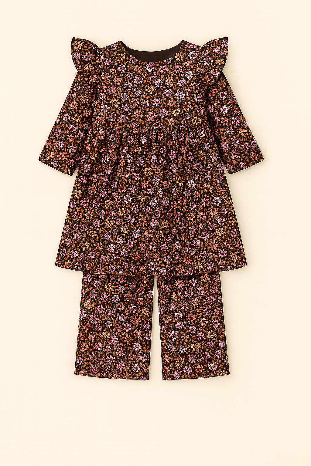Sweet and playful, this 2-piece kurta set features a charming floral print in shades of pink and orange against a rich black base. With frilled shoulder details and a gathered waist, the kurta pairs perfectly with matching straight-leg trousers. Ideal for festive occasions or cheerful everyday moments, this outfit offers both comfort and style for ages 6 to 12.