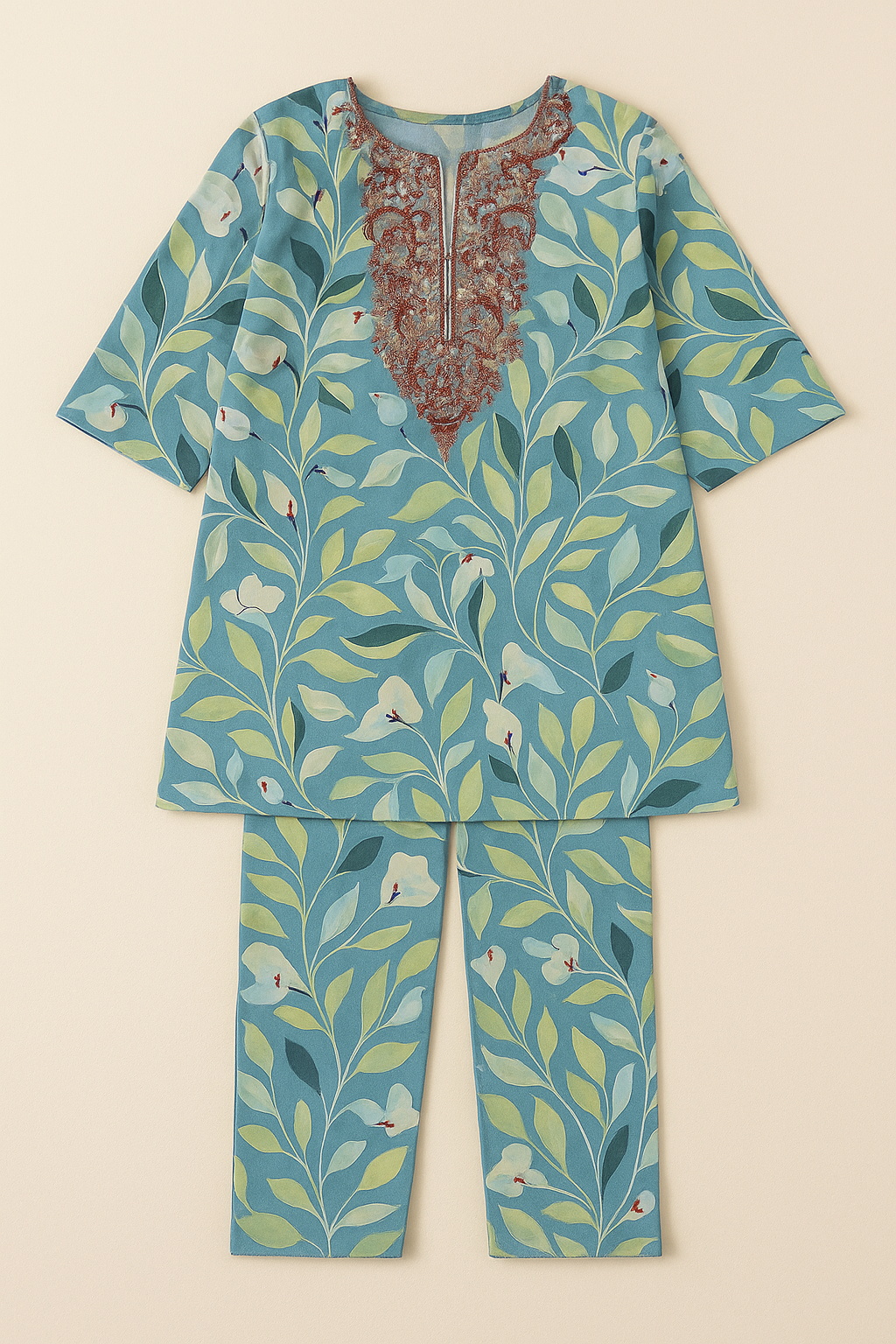 Rich and radiant, this 2-piece kurta set blooms with a deep blue base adorned with vibrant red floral embroidery around the neckline and matching printed motifs across both pieces. The straight-fit kurta is paired with coordinated trousers, creating a harmonious and stylish silhouette. Finished with earthy-toned sandals, this outfit effortlessly blends tradition with modern charm. Perfect for festive occasions, casual meetups, or cultural events ideal for ages 6 to 12.