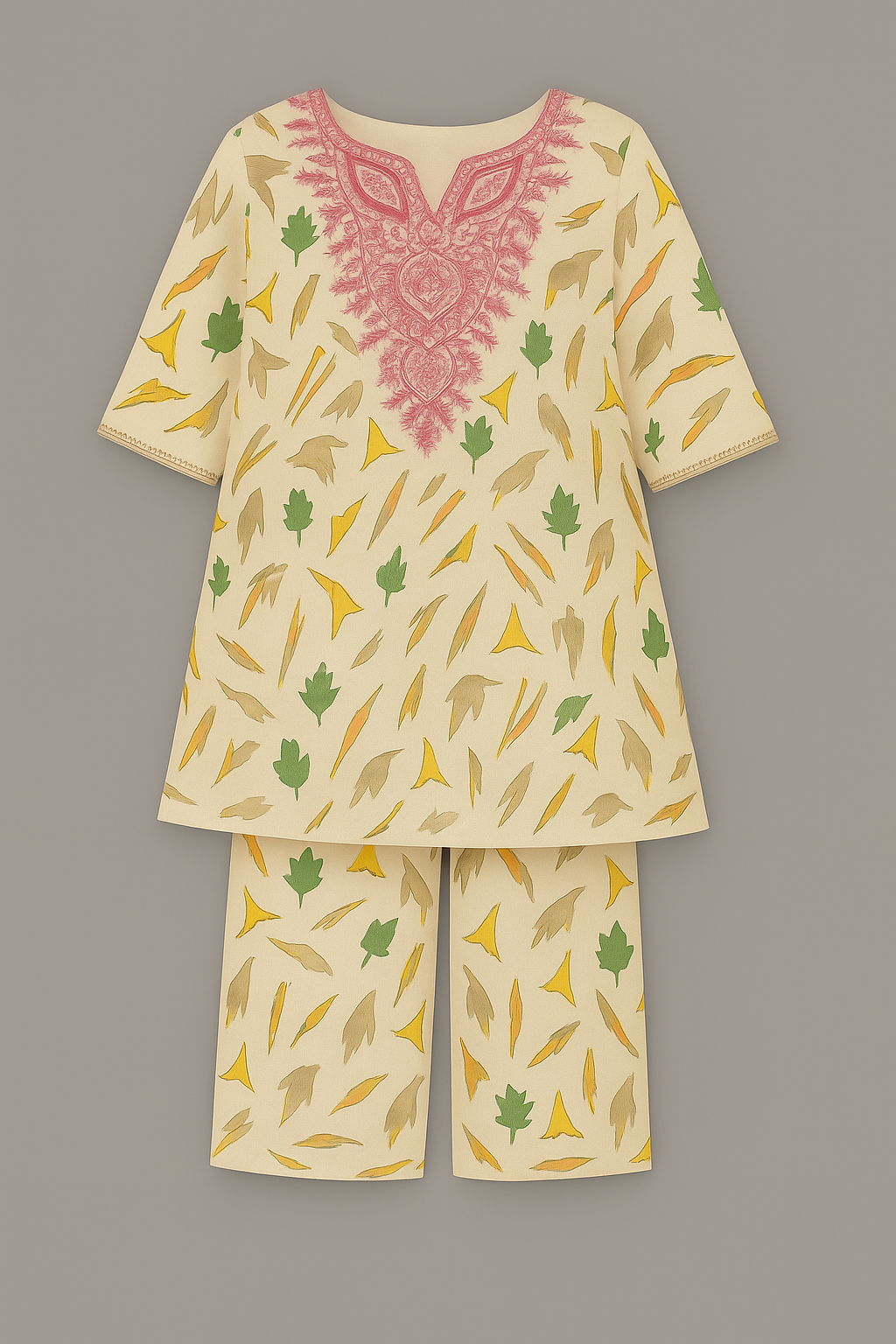 Soft, elegant, and full of charm — this ivory-toned 2-piece kurta set features a delicate leaf and floral print in earthy hues, beautifully contrasted with intricate pink embroidery on the neckline. Paired with matching straight trousers, this outfit is perfect for casual outings or festive moments, offering both comfort and timeless style. Suitable for ages 6 to 12.
