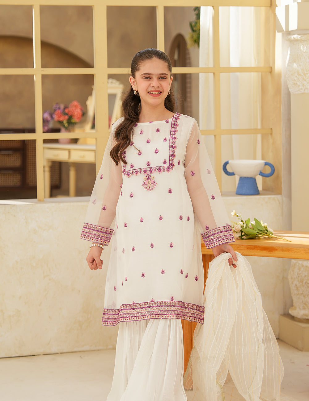 An ivory organza shirt with vibrant magenta embroidery, styled with ivory silk sharara trousers.