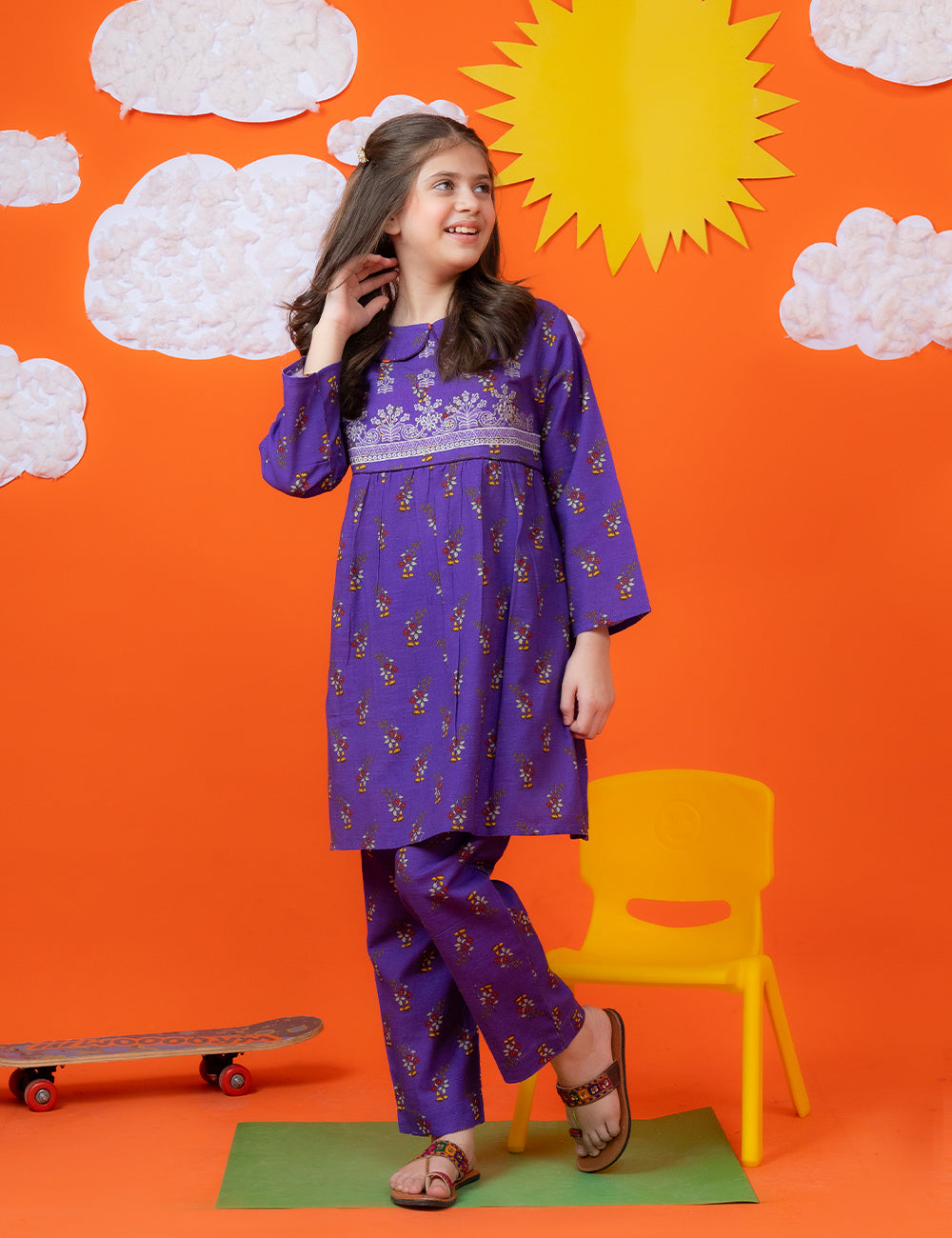 The tunic-style top features a lovely soft purple hue adorned with a charming all-over subtle floral print. Its distinguishing features are the adorable Peter Pan collar and a beautiful contrasting print/embroidery panel on the yoke, which adds a structured, elegant touch. The top has comfortable full-length sleeves and a classic A-line silhouette. The set is completed with matching, comfortable straight-cut trousers in the same unique Khadar print. This delightful ensemble ensures she stays stylish and warm from dawn till dusk, making it a perfect, unique statement piece for any sophisticated occasion.