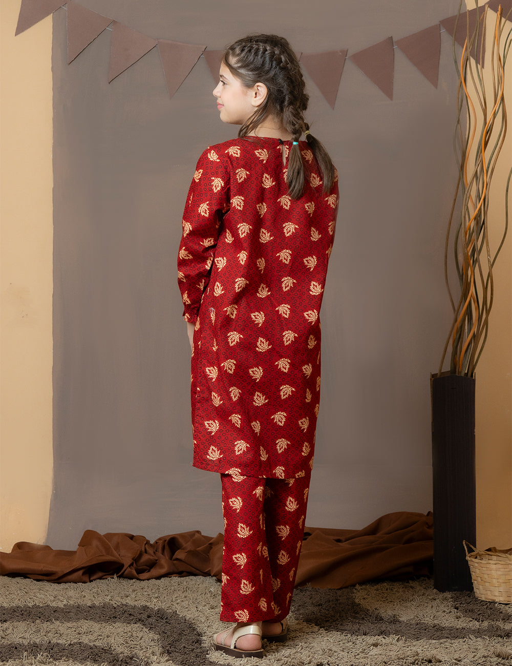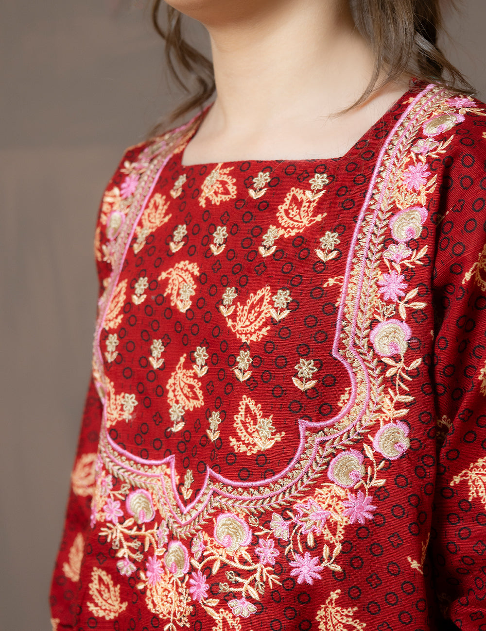 The tunic-style top features a rich, deep maroon hue adorned with a beautiful, repeated gold-colored block print (or similar print) in a floral or paisley motif. The neckline and gathered full-length sleeves are accented with intricate multi-colored embroidery in warm tones, adding a luxurious touch. The set is completed with matching, comfortable straight-cut Trousers in the same patterned maroon Khadar. This delightful ensemble ensures she stays stylish and warm from dawn till dusk, making it a perfect, unique statement piece for any occasion.