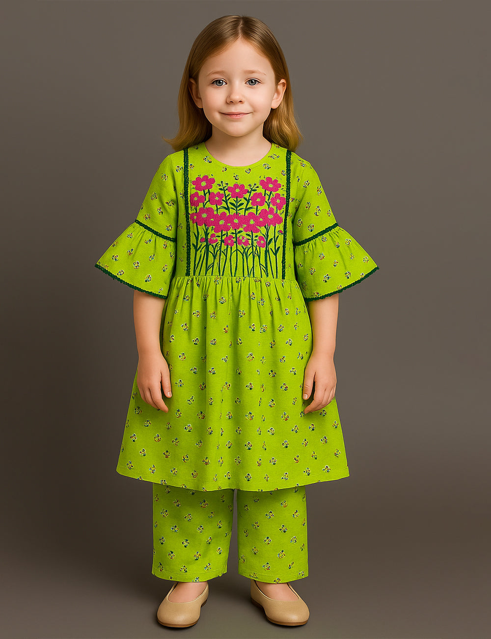Fresh and full of charm, this 2-piece kurta set features a vibrant lime green base adorned with delicate floral sprigs. The bodice bursts to life with bright pink embroidered flowers, framed by deep green piping for a polished touch. Bell sleeves add a whimsical flair, while the matching printed trousers complete the coordinated look. Designed for girls aged 6 to 12, it's the perfect outfit for daytime outings, Eid gatherings, or garden celebrations.