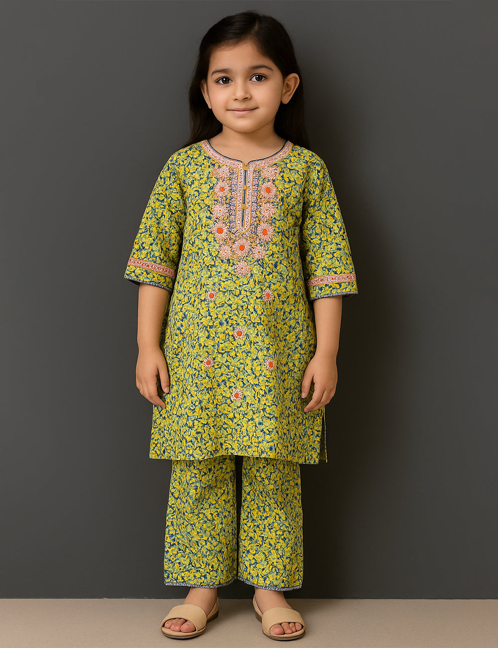 Delicate and vibrant, this 2-piece kurta set features a lush green floral print with soft pink and orange embroidery along the neckline and sleeves. Paired with wide-leg matching trousers, it offers both flair and comfort. Designed for girls aged 6 to 12, this breezy ensemble is perfect for daytime celebrations, spring events, or weekend outings bringing nature’s charm to everyday style.