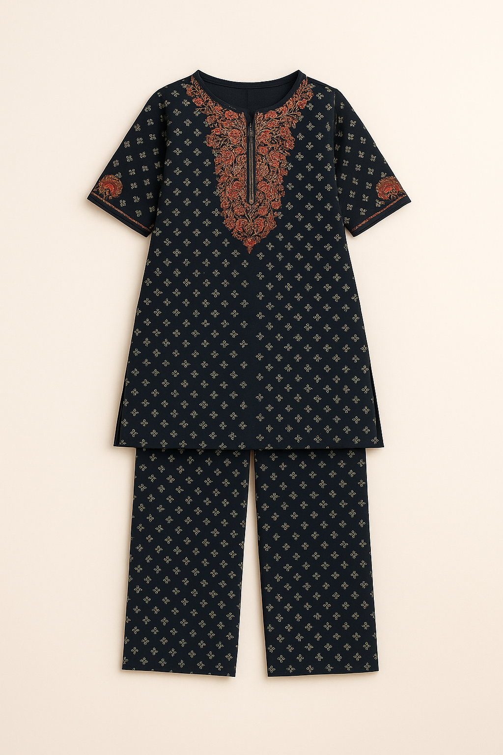 Midnight Motif 2-Piece Kurta Set This elegant 2-piece kurta set features a sophisticated motif design paired with intricate embroidery around the neckline, showcasing refined craftsmanship. Designed for girls aged 6 to 12, the matching trousers offer a comfortable and coordinated fit. Perfect for festive occasions, garden parties, or casual family gatherings, this set combines timeless style with effortless grace.