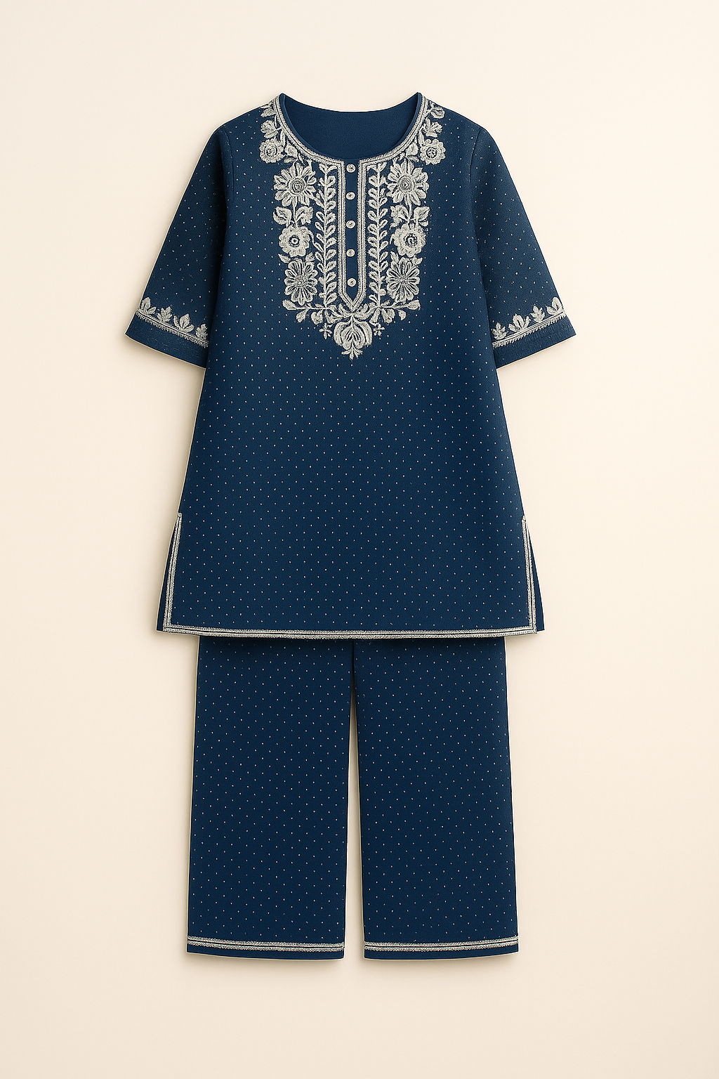 Elegant and captivating, this 2-piece kurta set showcases a deep navy base highlighted with intricate white embroidery cascading across the neckline and sleeves. The straight-fit kurta teams seamlessly with matching trousers, creating a clean and refined silhouette. Finished with earthy brown shoes and set against a serene backdrop, this outfit blends timeless tradition with a touch of modern flair. Perfect for festive evenings, cultural celebrations, or stylish family gatherings—ideal for ages 6 to 12.
