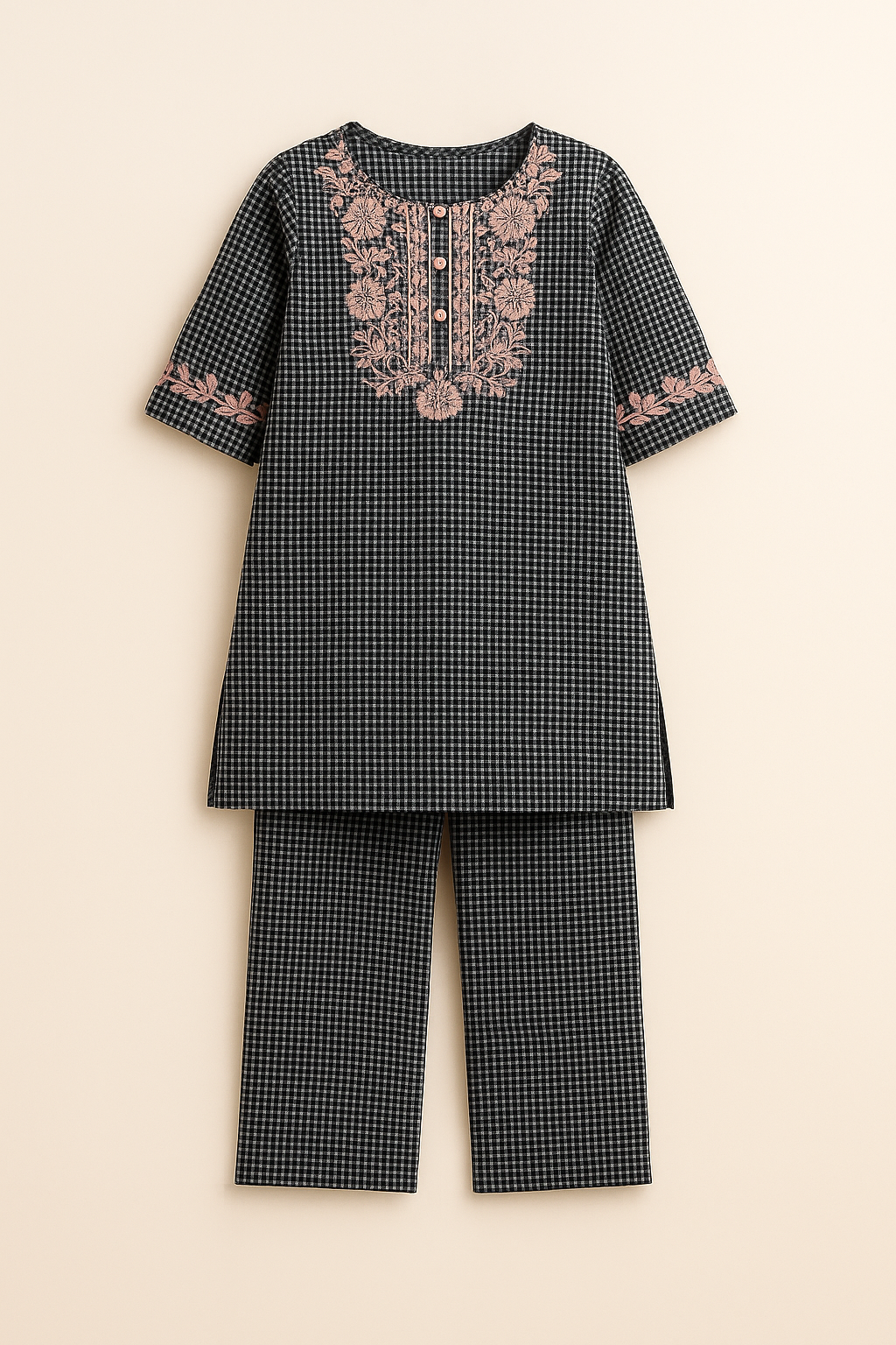This enchanting 2-piece kurta set showcases a delicate floral print enhanced by intricate embroidery around the neckline, reflecting fine craftsmanship. The coordinating trousers offer a seamless, elegant ensemble perfect for girls aged 6 to 12. Ideal for garden parties, festive gatherings, or casual family outings.