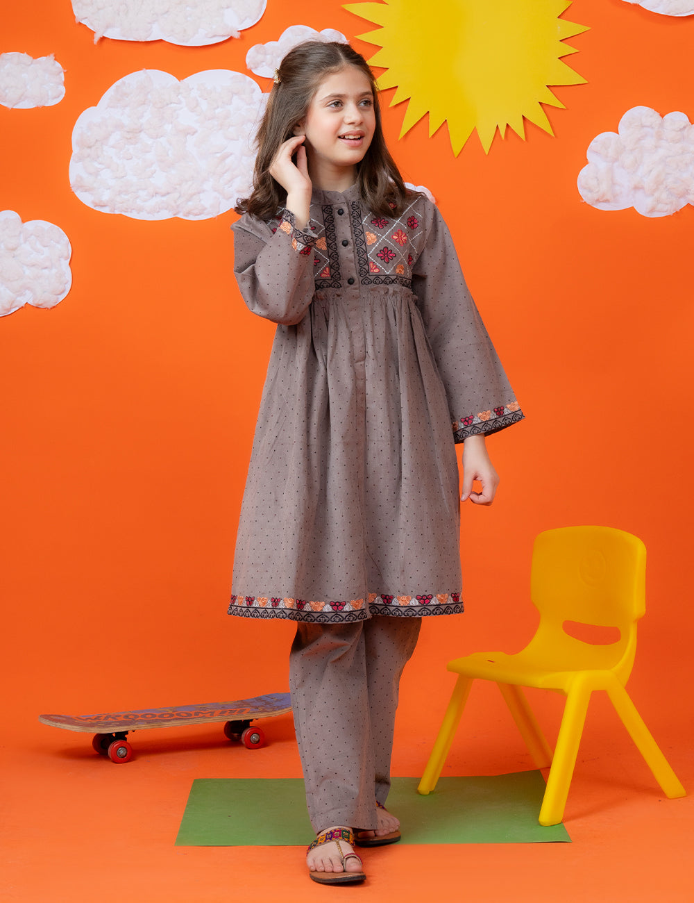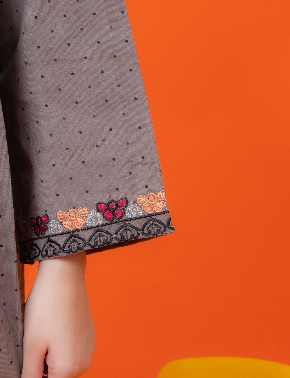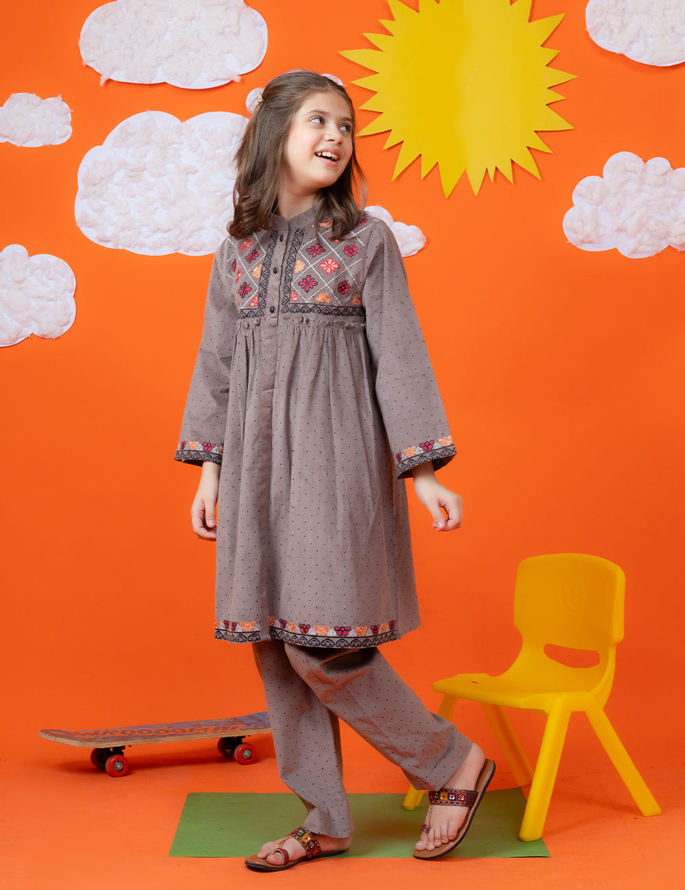 The tunic-style top features a sophisticated warm grey hue with a subtle dot-like texture, beautifully adorned with vibrant, multi-colored geometric and floral embroidery on the yoke, down the front placket, and on the full-length sleeves. A delicately smocked or gathered detail under the bodice creates a flattering silhouette. The set is completed with matching straight-cut pants in the same patterned gray Cortia, featuring complementary colorful embroidery at the hem. This elegant ensemble ensures she stays stylish and comfortable from dawn till dusk, making it a perfect, unique statement for any occasion.