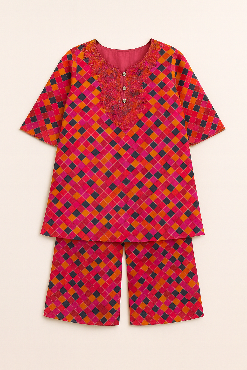 Vibrant and full of personality, this 2-piece kurta set dazzles with a multicolored mosaic print in shades of pink, orange, blue, and purple. The front features intricate threadwork and playful buttons, while the flared pants add a touch of drama. Designed for girls aged 6 to 12, this lively ensemble is perfect for birthday parties, festive fun, or playful everyday wear. A bold statement of style and joy!