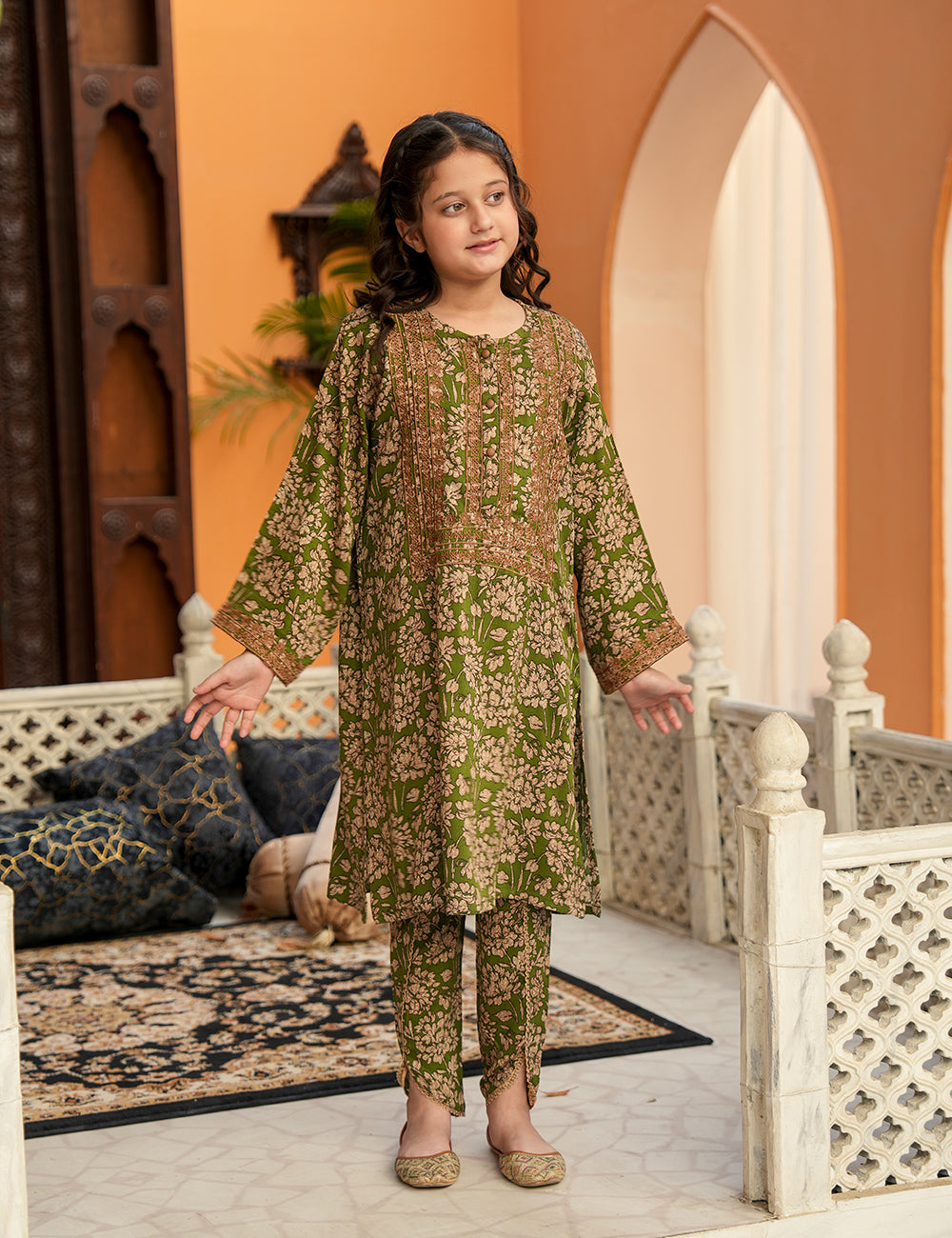 Olive Petals is a graceful mid-summer ensemble inspired by nature’s calm tones and timeless florals. Designed in breathable cotail fabric, this 2-piece outfit features a soothing olive-green base adorned with delicate floral prints and an intricately detailed front panel. Its airy silhouette ensures all-day comfort while keeping the look effortlessly elegant for warm summer days.