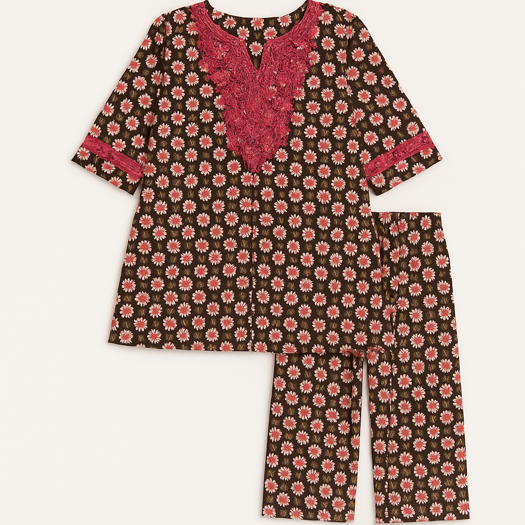 Sweet and charming, this 2-piece kurta set features a dark floral base with soft pink and white blossoms scattered across. The vibrant pink embroidered neckline and sleeve cuffs add a pop of color and detail to the simple silhouette. The set comes with matching trousers, ensuring comfort and style for girls aged 6 to 12. Perfect for casual gatherings, family get-togethers, or festive days, this outfit is as playful as it is pretty.
