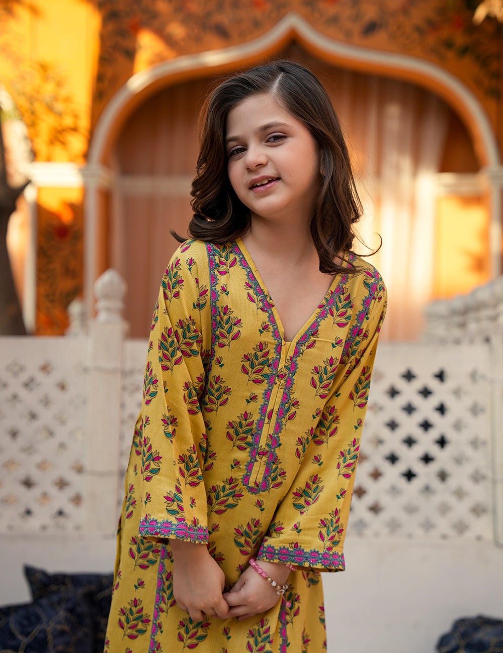 Sunpetal Meadow is a refreshing 2-piece outfit designed for effortless summer elegance. Crafted in lightweight cotail fabric, this mustard-yellow ensemble is adorned with delicate multicolor floral motifs and refined contrast detailing along the neckline and sleeves. Breathable, airy, and charming—perfect for warm mid-summer days.