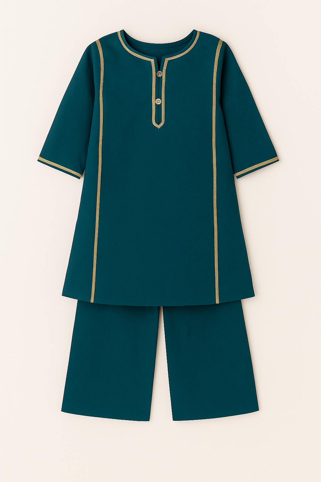 Minimal yet striking, this 2-piece kurta set features a rich teal base adorned with fine golden detailing along the neckline, sleeves, and sides. The straight-fit kurta paired with simple tapered trousers offers a clean, graceful silhouette perfect for girls aged 6 to 12. Ideal for formal school events, festive dinners, or family outings, this ensemble blends timeless tradition with modern elegance.
