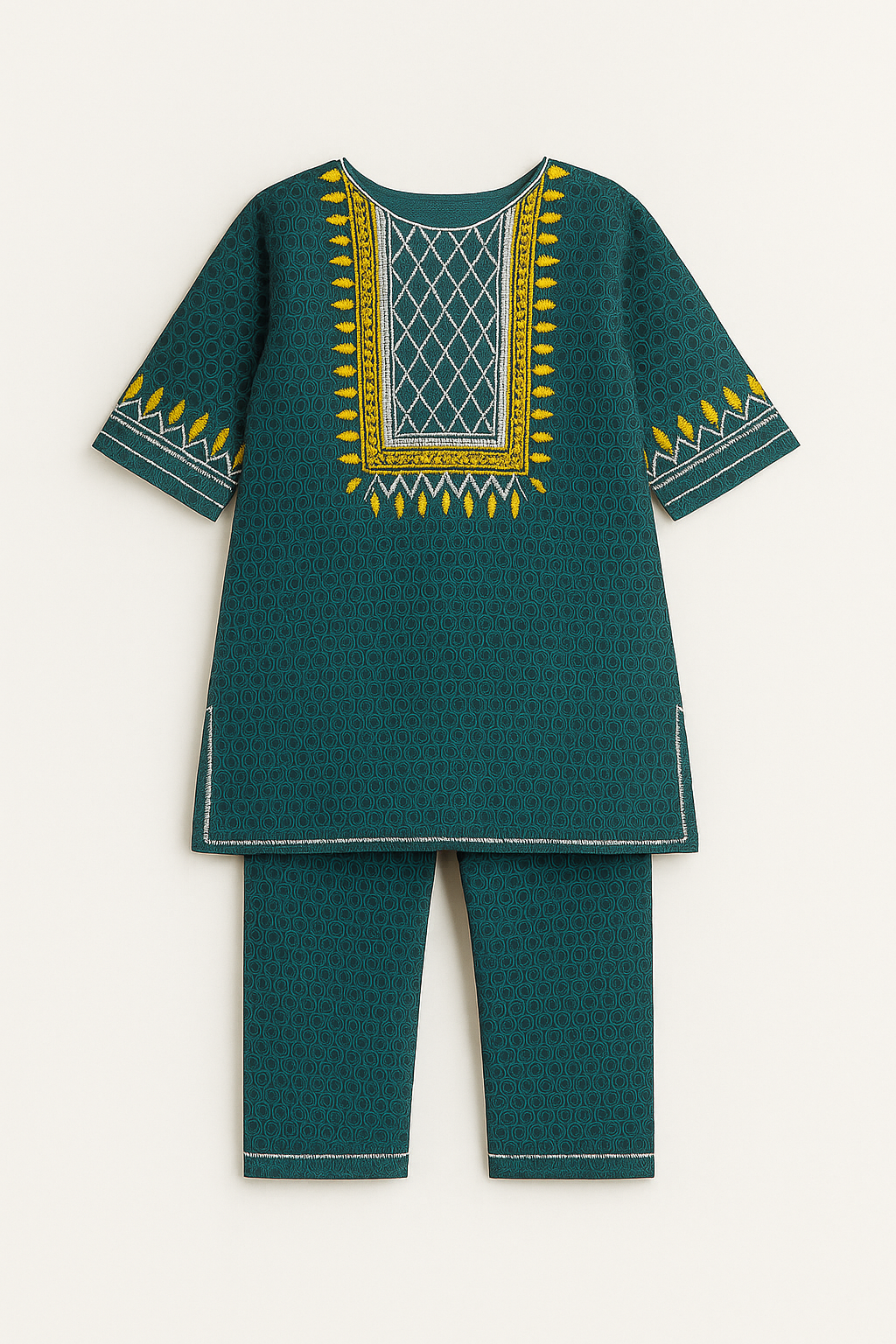 Bright and cheerful, this 2-piece kurta set flaunts a vibrant golden yellow floral print over a rich black base. The straight-cut kurta is accented with crisp white piping, adding a pop of contrast to the striking ensemble. Paired with matching trousers, this looks balances tradition and trend with effortless grace. Perfect for celebrations or daytime outings, this outfit offers both comfort and standout style ideal for ages 6 to 12.